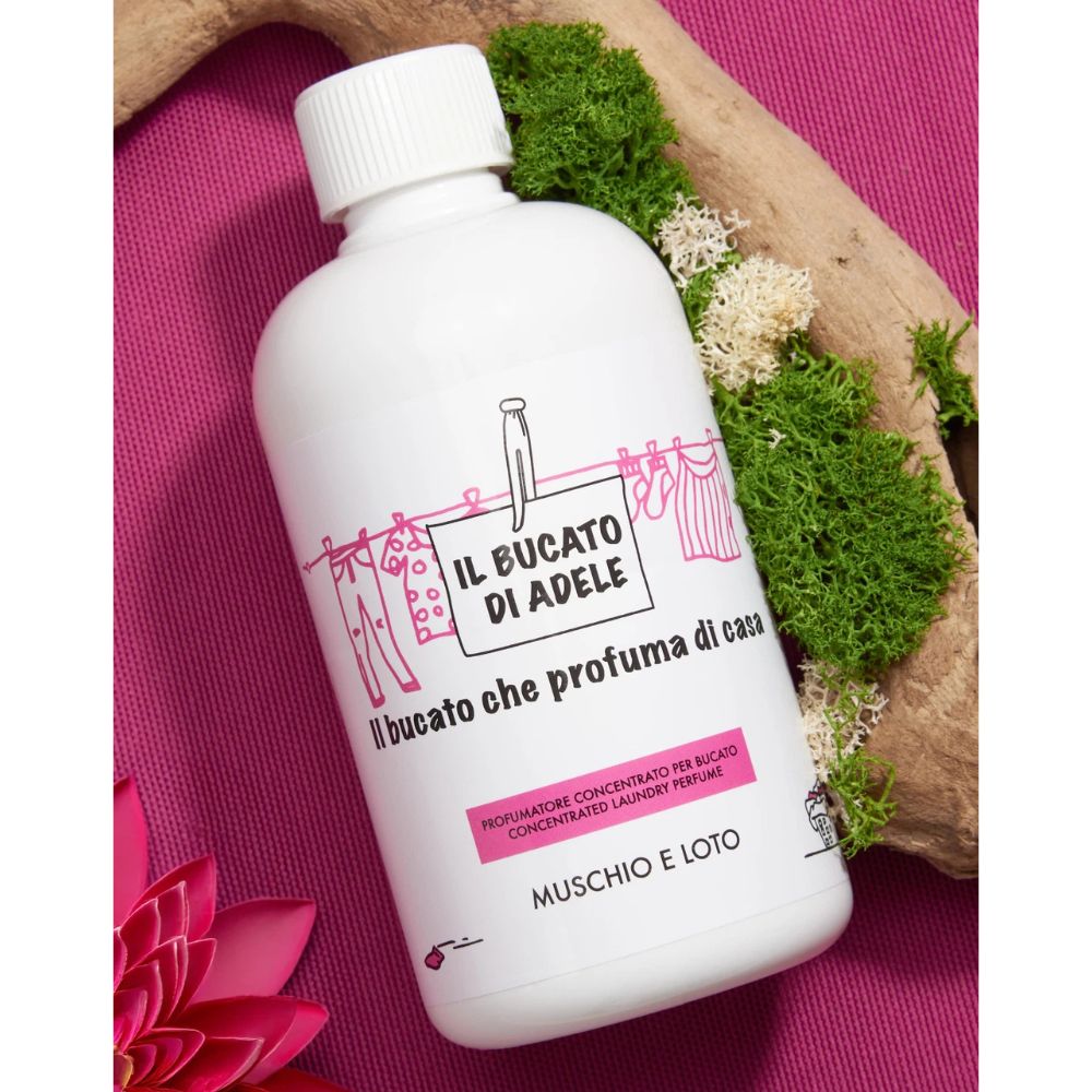 Muschio e Loto is een elegante en bloemige geur die de zachte verfijning van muskus combineert met de pure en delicate schoonheid van de lotusbloem. De geur geeft je kleding en textiel een fris, harmonieus en langdurig parfum dat rust en welzijn uitstraalt. â¨